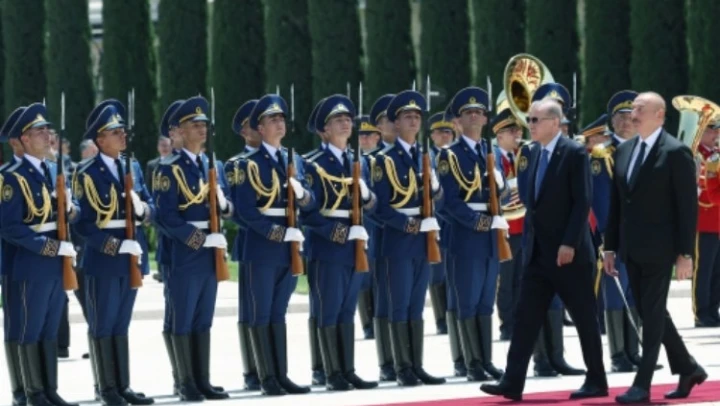 Cumhurbaşkanı Erdoğan, Azerbaycan Cumhurbaşkanı Aliyev tarafından resmî törenle karşılandı. Azerbaycan ziyaretinde Sinan Oğan da bulunuyor.