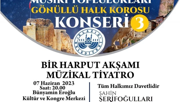 Elazığ Belediyesi Basın-Yayın ve Halkla İlişkiler Müdürlüğü'nden yapılan açıklamada, 'Elazığ Belediyesi Kültür ve Sosyal İşler Müdürlüğü'ne bağlı musiki toplulukları tarafından oluşturulan Gönüllü Halk Korosu'nun üçüncüsünü gerçekleştireceği konserde gönüllü halkımız Harput eserlerini seslendirecek ve Harput hikayelerini canlandıracak. 'Bir Harput Akşamı' adlı müzikal tiyatro konserimiz ise halkımızla buluşacak. 7 Haziran Çarşamba günü Bünyamin Eroğlu Kültür ve Kongre Merkezi'nde saat 20.00'de gerçekleştireceğimiz konserimize tüm halkımız davetlidir' denildi.