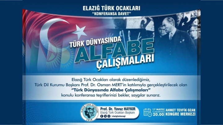 Elazığ Türk Ocağı düzenli aralıklarla tertip ettiği etkinliklerine bir yenisiyle daha devam ediyor. Bu amaçla konuşmacı olarak Türk Dil Kurumu Başkanı Prof. Dr. Osman Mert'in katılacağı 'Türk Dünyasında Alfabe Çalışmaları' isimli bir konferans düzenlenecek.