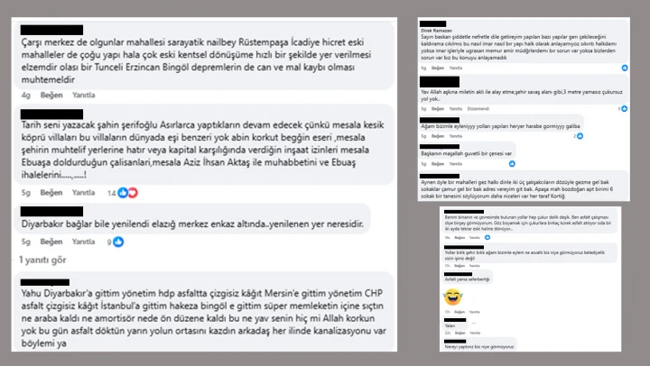 Elazığ Belediye Başkanı Şahin Şerifoğulları'nın, Elazığ Belediyesi'nin resmi hesapları ile haber sitelerinde belediyeye ilişkin yapılan paylaşımların altına yorum yapan vatandaşlar, çeşitli konularda tepkilerini dile getiriyor. Yapılan yorumlarda; belediyenin hizmet anlayışı, projelerin hayata geçirilme süreci ve yerel yönetim uygulamalarına yönelik eleştiriler öne çıkıyor.