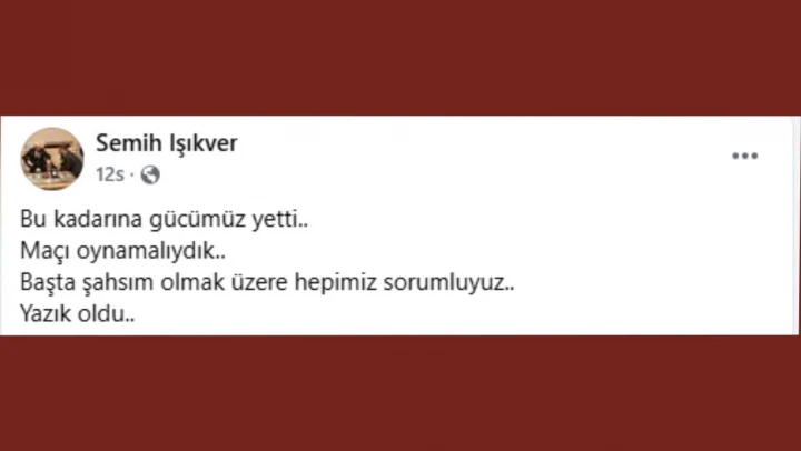 Işıkver maç sonrası sosyal medya hesabından yaptığı paylaşımda şu ifadelere yer verdi.Bu kadarına gücümüz yetti.. Maçı oynamalıydık.. Başta şahsım olmak üzere hepimiz sorumluyuz.. Yazık oldu..