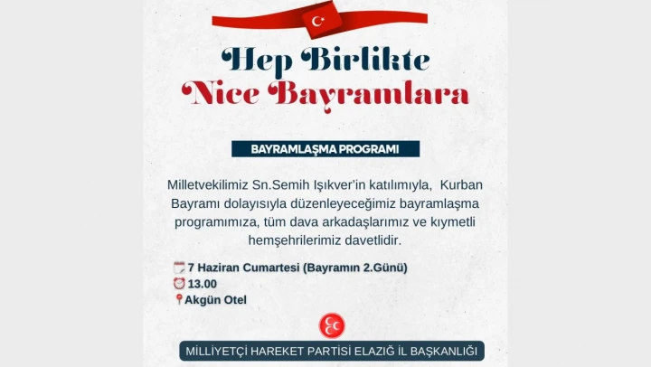 MHP Elazığ Milletvekili Semih Işıkver'in katılımıyla düzenlenecek bayramlaşma programı 7 Haziran Cumartesi (Bayramın 2.günü) saat :13.00 'de Akgün Otel'de gerçekleştirilecek.