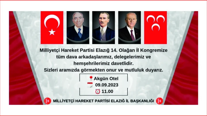 Milliyetçi Hareket Partisi Elazığ 14.Olağan il kongresi 9 Eylül Cumartesi günü saat 11.de Akgün Otel'de yapılacak.