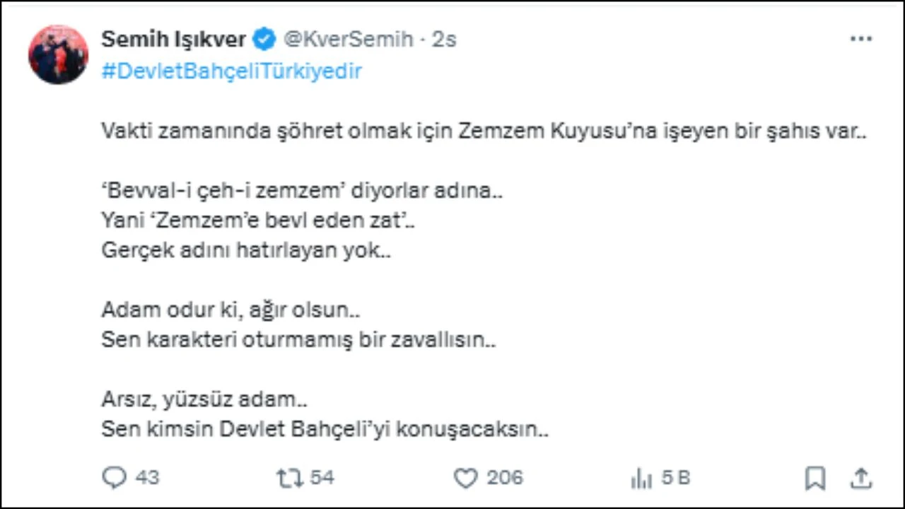 MHP Elazığ Milletvekili Semih Işıkver, X hesabından yaptığı açıklamada Anahtar Parti Genel Başkanı Yavuz Ağıralioğlu'na sert tepki gösterdi.
