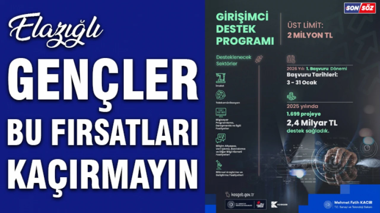 “Girişimcilerimize 2 milyon TL’ye kadar destek sağlıyoruz. KOSGEB Girişimci Destek Programı İş Geliştirme Desteği ile imalat, bilişim ve bilimsel araştırma alanlarında faaliyet gösteren girişimcilerimizin personel, yazılım, makine-teçhizat ve kalıp ile hizmet alımı giderlerine katkı sunuyoruz. 2025 yılında 1.699 proje için 2,4 milyar TL destekleme kararı aldık. 2026’da daha fazla girişimcimizi üretime, yeniliğe ve güçlü bir geleceğe taşımayı hedefliyoruz. Başvuru tarihleri: 3–31 Ocak 2026.”