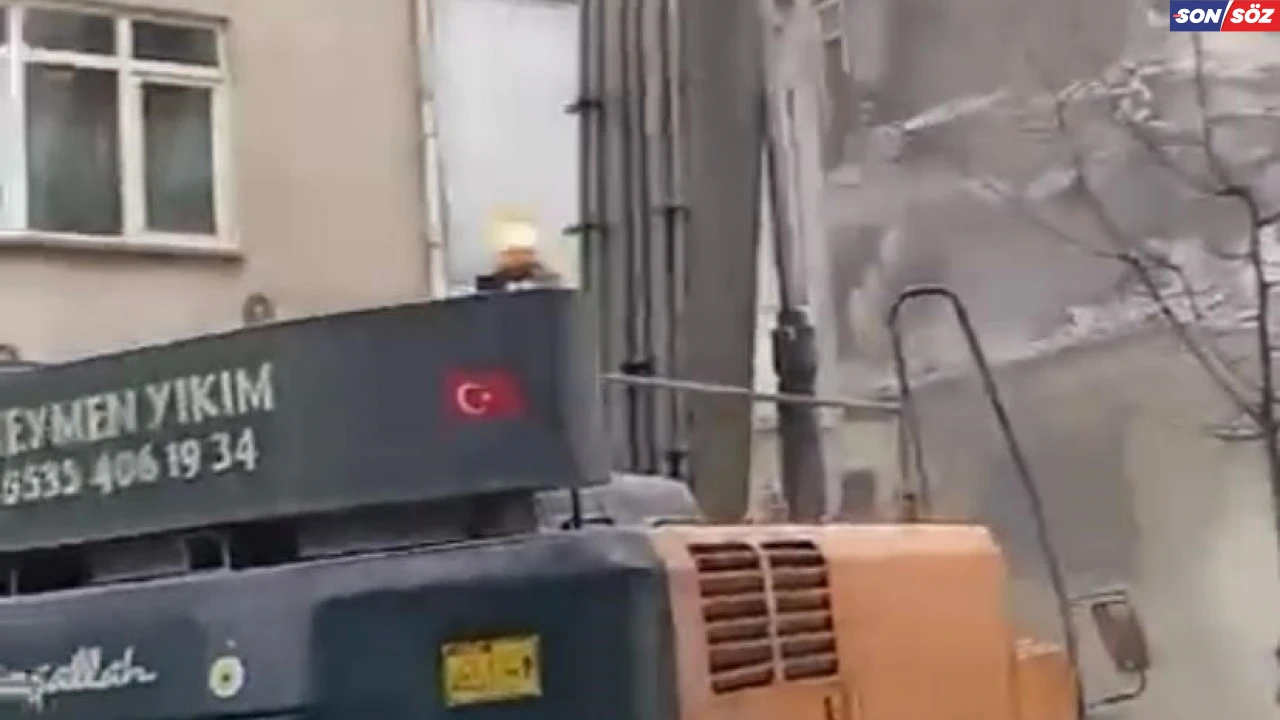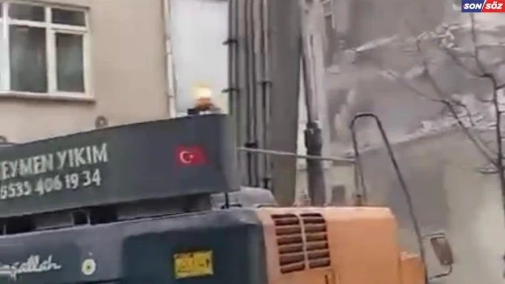 Kahramanmaraş merkezli depremlerde Elazığ’da ağır hasar alan bina, iş makinesinin dokunmasıyla yerle bir oldu.