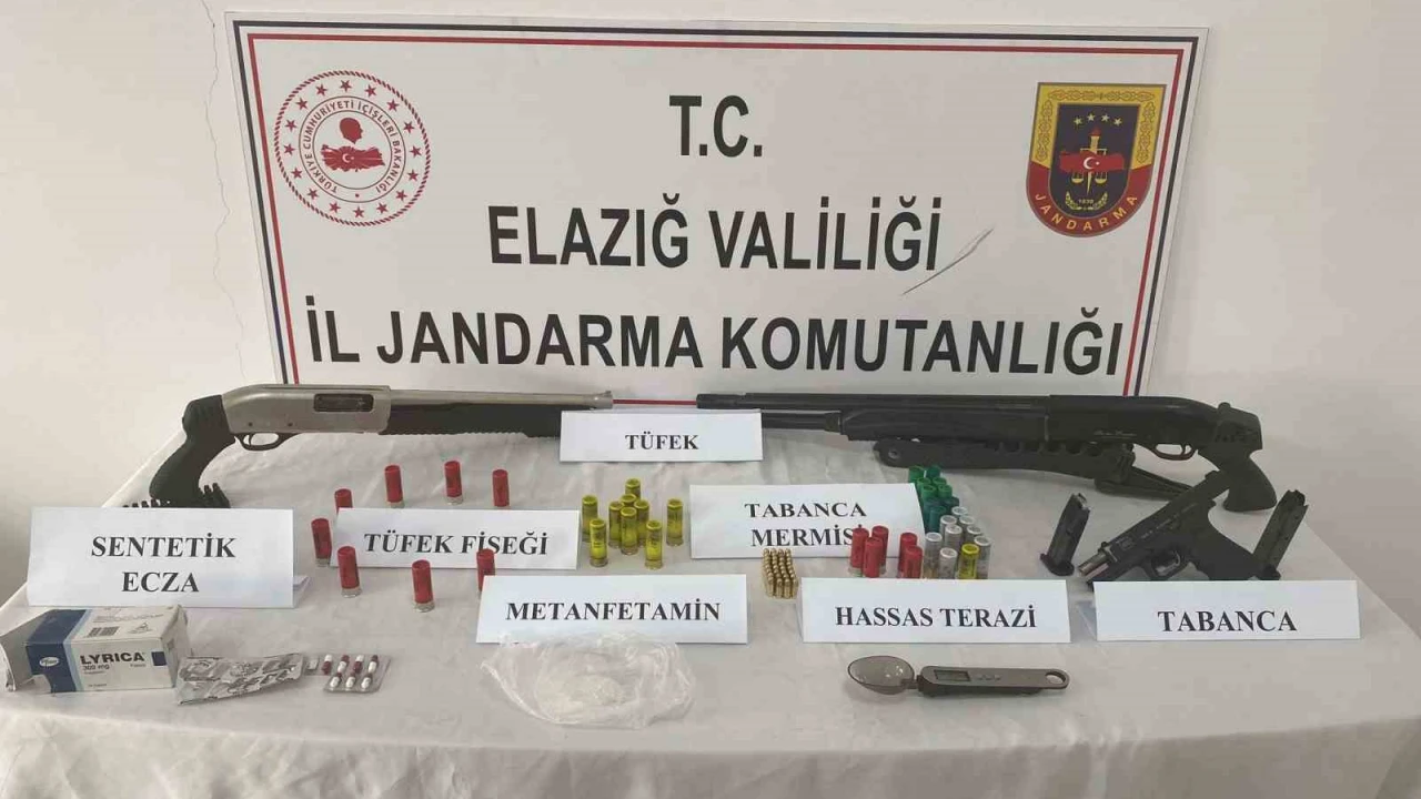 İş yerinde yapılan aramada, 21 gram metamfetamin, 7 adet Lyrıca hap, 1 adet hassas tartı, 2 adet ruhsatsız pompalı tüfek, 1 adet ruhsatsız tabanca, 32 adet tabanca fişeği, ve 13 adet av tüfeği fişeği ele geçirildi.