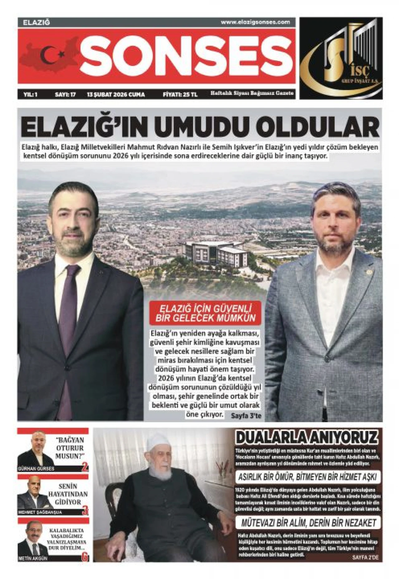 Elazığ’ın yedi yıldır çözüm bekleyen kentsel dönüşüm sorununun sona ermesi için Elazığlılar, 2026 yılının bu sorunun tamamen çözüldüğü yıl olmasını istiyor. Elazığ halkı, Elazığ Milletvekilleri Mahmut Rıdvan Nazırlı ile Semih Işıkver’in bu sorunu çözeceğine dair güçlü bir inanç taşıyor.