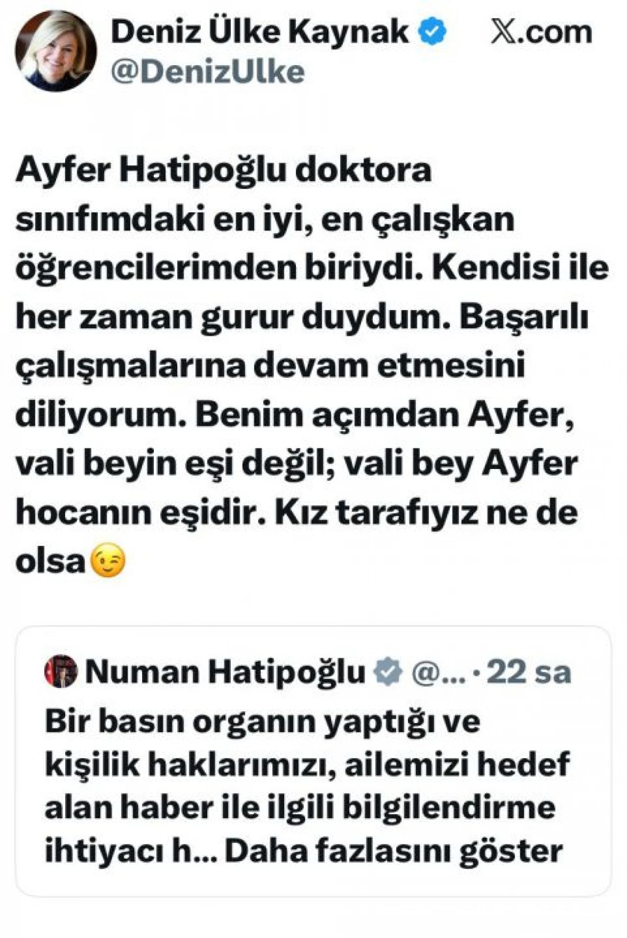 Ülkemizin önde gelen ve saygın akademisyenlerinden biri olan Prof. Dr. Kaynak, doktora döneminde öğrencisi olan Hatipoğlu’na ilişkin şu ifadeleri kullandı:”Ayfer Hatipoğlu, doktora sınıfımdaki en iyi ve en çalışkan öğrencilerimden biriydi. Kendisi ile her zaman gurur duydum. Başarılı çalışmalarına devam etmesini diliyorum. Benim açımdan Ayfer, vali beyin eşi değil; vali bey Ayfer hocanın eşidir. Kız tarafıyız ne de olsa.”