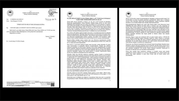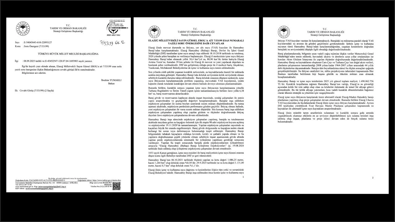 CHP Elazığ Milletvekili Gürsel Erol’un yazılı soru önergesine yanıt veren Bakanlık, Elazığ ilinin içme ve kullanma suyunun dağıtımı ile su kesintilerine ilişkin tüm yetki ve sorumluluğun Elazığ Belediyesi’nde olduğunu vurguladı.