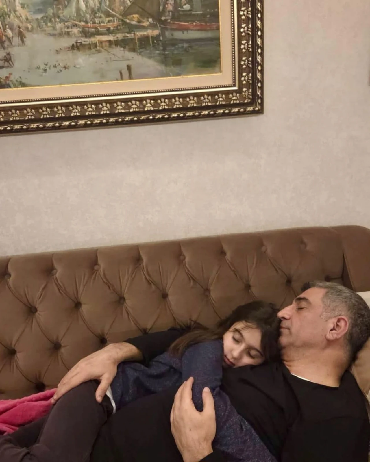 Bir baba ve bir çocuk, koltukta uyuya kalmış.